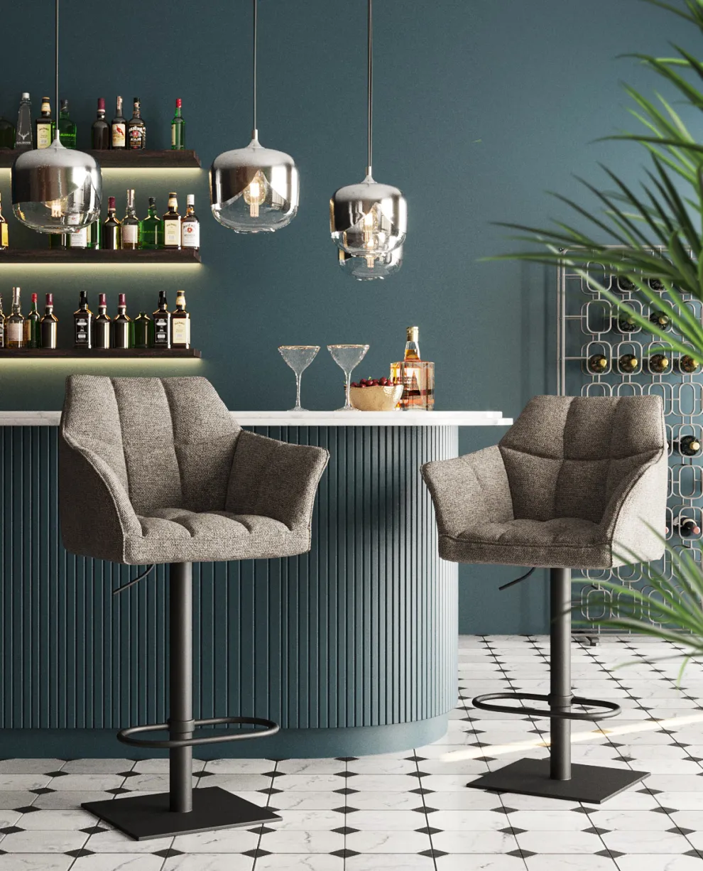 Een wonder van zitcomfort: de Thinkthank stoel serie maakt indruk met zijn volumineuze, gestikte stoffering, schelpvormig ontwerp, comfortabel geronde armleuningen en neutrale interieurkleuren. Deze barkruk in grijs kan als vele opties dienen: als kruk bij de thuisbar, als een stoel voor bij het aanrecht in de keuken of als eetkamerstoel aan een hoge eettafel.