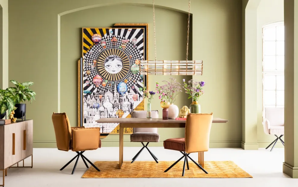 Een denkbeeldige interpretatie van de gestoffeerde stoel: De stoel is gebaseerd op een vloerkussen met knoop naaiwerk, terwijl de gestoffeerde rugleuning op een bankkussen lijkt met kapnaden. Samen zorgt dit voor een echte comfortabele stoel die er stijlvol uitziet met een fluwelen look en iedere behoefte van comfortabel zitten vervult, aan de eettafel of het bureau.
