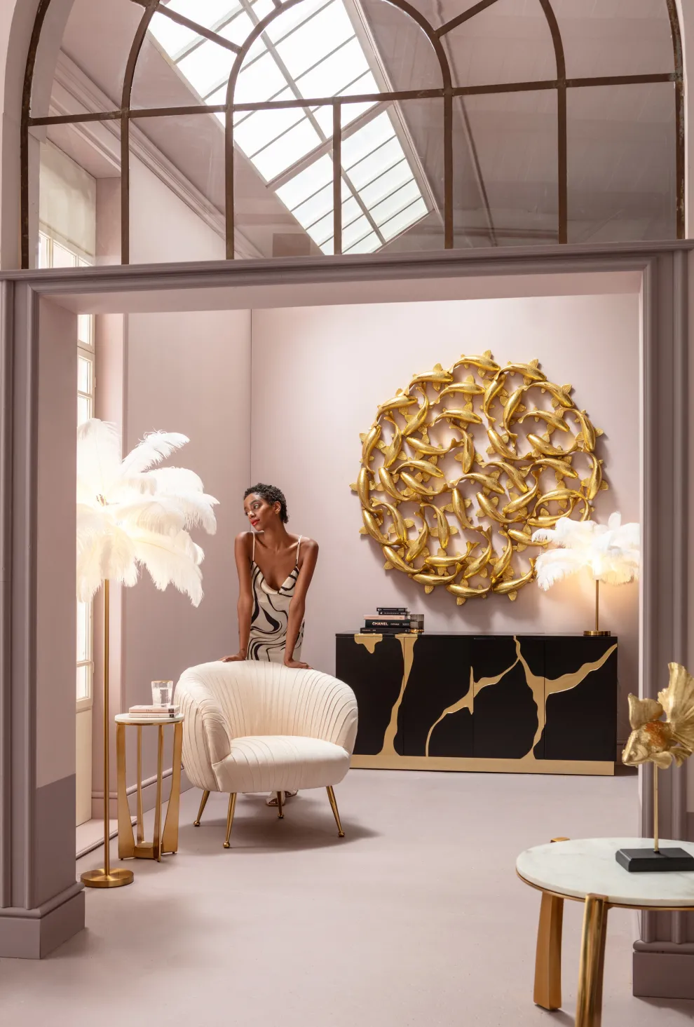 Fauteuil of statement! Een elegante fluwelen fauteuil in de stijl van de jaren 20. De organische silhouette en uitgebreide vouwen van de zachte hoes zorgen voor een unieke, luxe look. Een fauteuil die voor stijlvol glamour zorgt. Ook beschikbaar als een bank.
