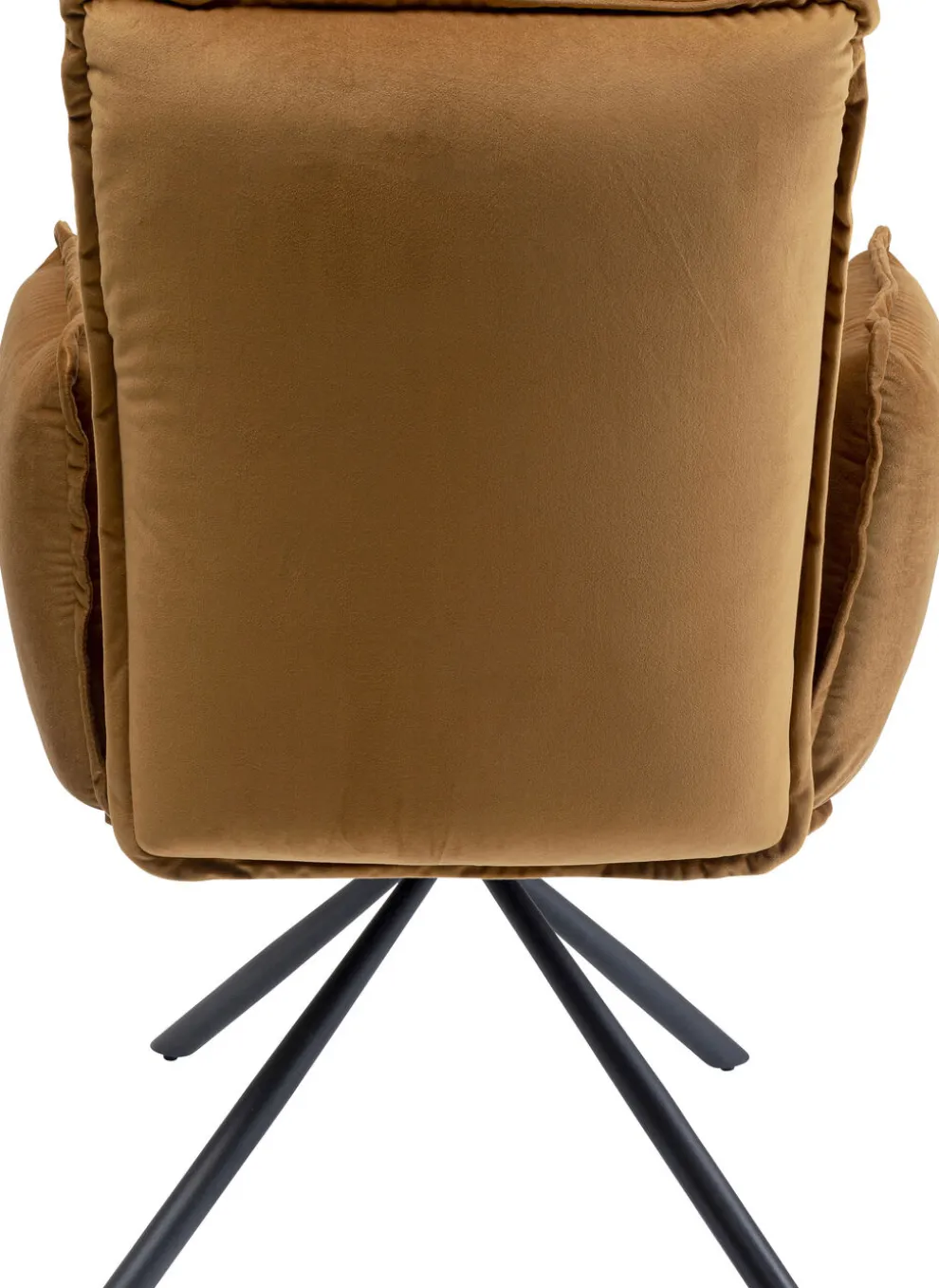 Een denkbeeldige interpretatie van de gestoffeerde stoel: de stoel is gemodelleerd als een kussen met knoop stiksels, terwijl de gestoffeerde rugleuning eruit ziet als een bankkussen met pijpnaden. Samen maken ze een comfortabele gestoffeerde stoel die er stijlvol uitziet met een fluwelen look en een combinatie van mokka en chocolade-bruin, voldoenend aan iedere eis van comfortabel zitten, zowel aan de eettafel als aan het bureau.