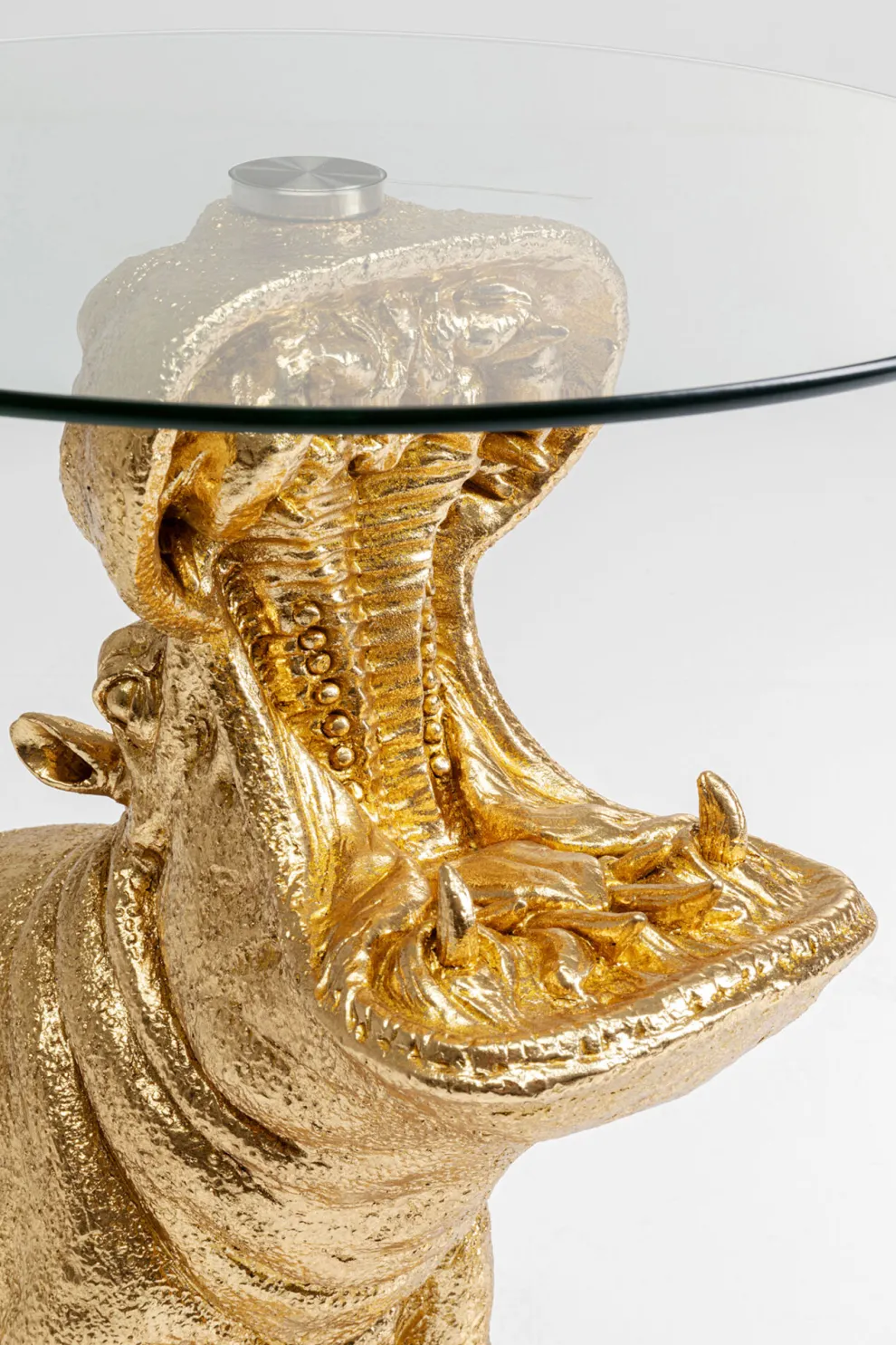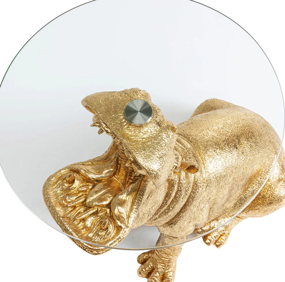 Het blad van gehard glas met een dikte van 0.7 cm, rust op een gouden polyresine basis die de elegante vorm van een zittende neushoorn aanneemt. Deze tafel weegt slechts 5.4 kg en biedt een perfecte combinatie van lichtheid en stabiliteit. De gouden kleur van zowel de poten als het frame straalt luxe uit, terwijl het ronde, transparante glazen blad een gevoel van ruimte behoudt.