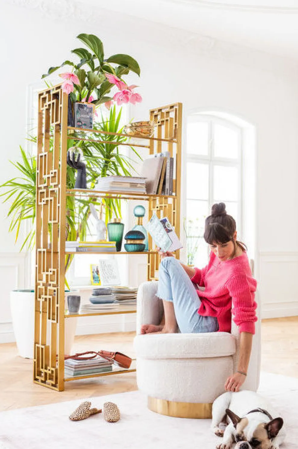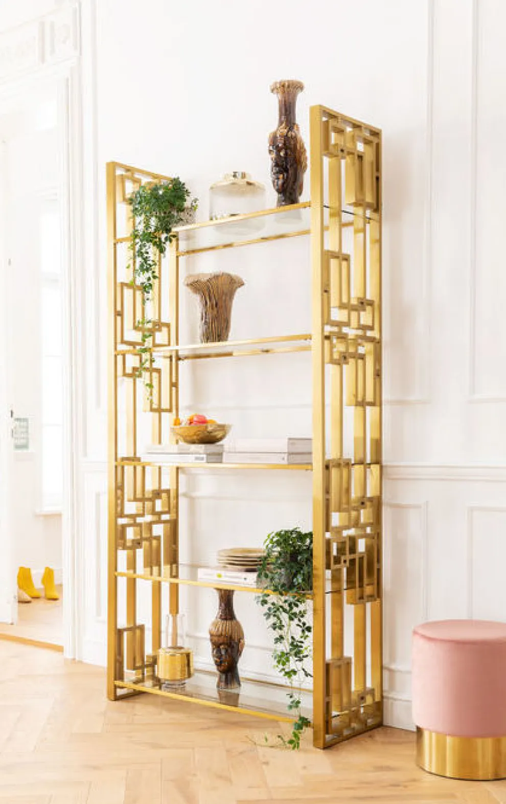Wauw! Deze boekenkast in de Hollywood Regency stijl is een echt kunstwerk. De onmiskenbare elegante stijl van de meubels, die de sterren van de jaren vijftig zo glamoureus maakten, ervaren hier een stijlvolle comeback. De boekenkast met messing afwerking en grafische zijpanelen stralen een sierlijke en moderne sfeer uit. Andere modellen van de Boulevard serie zijn beschikbaar.