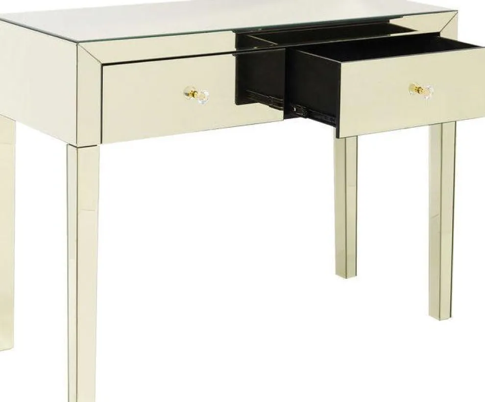 De console is afgewerkt met een prachtige spiegelkleur die een gevoel van ruimte en glamour toevoegt aan elke kamer. Met twee lades biedt de console ook praktische opbergruimte voor sleutels, post of andere kleine voorwerpen.