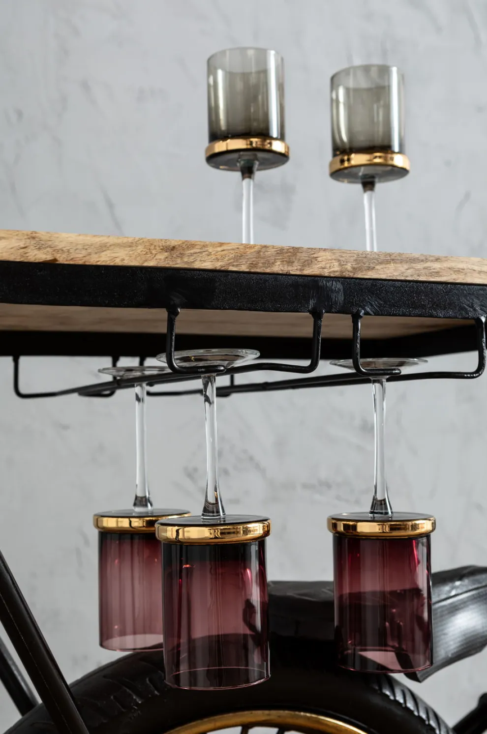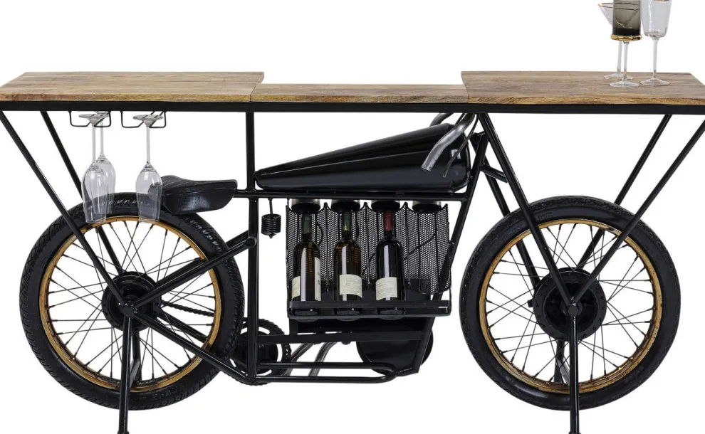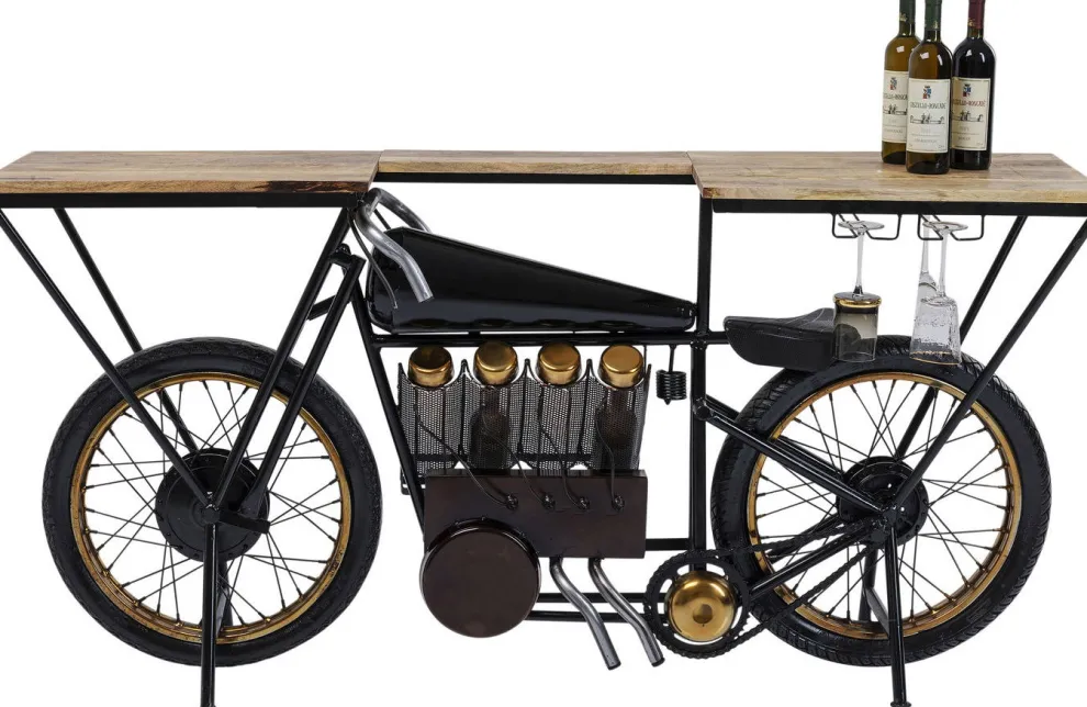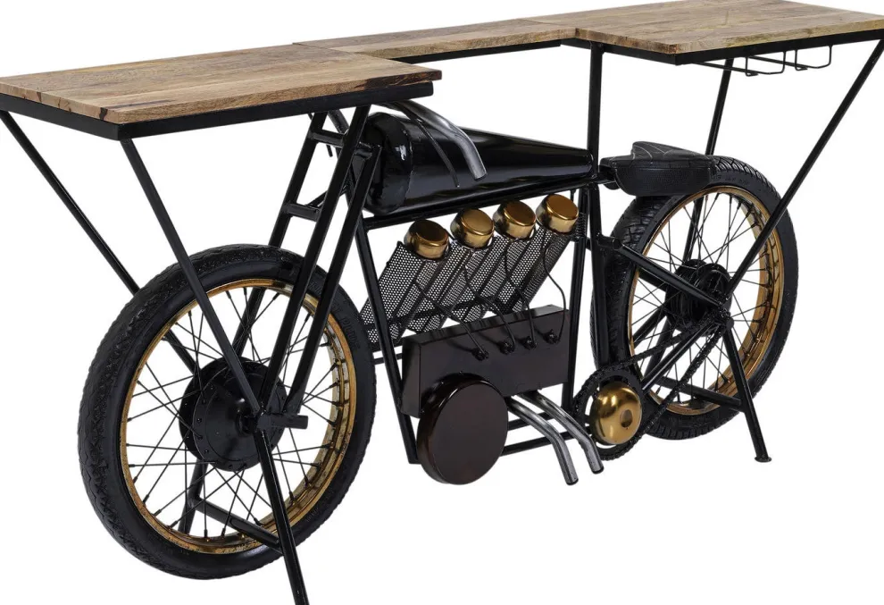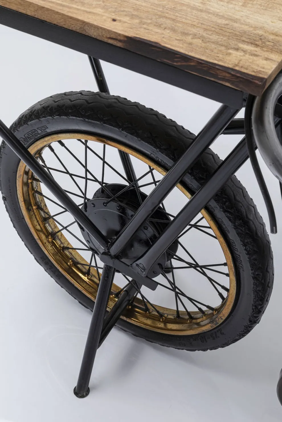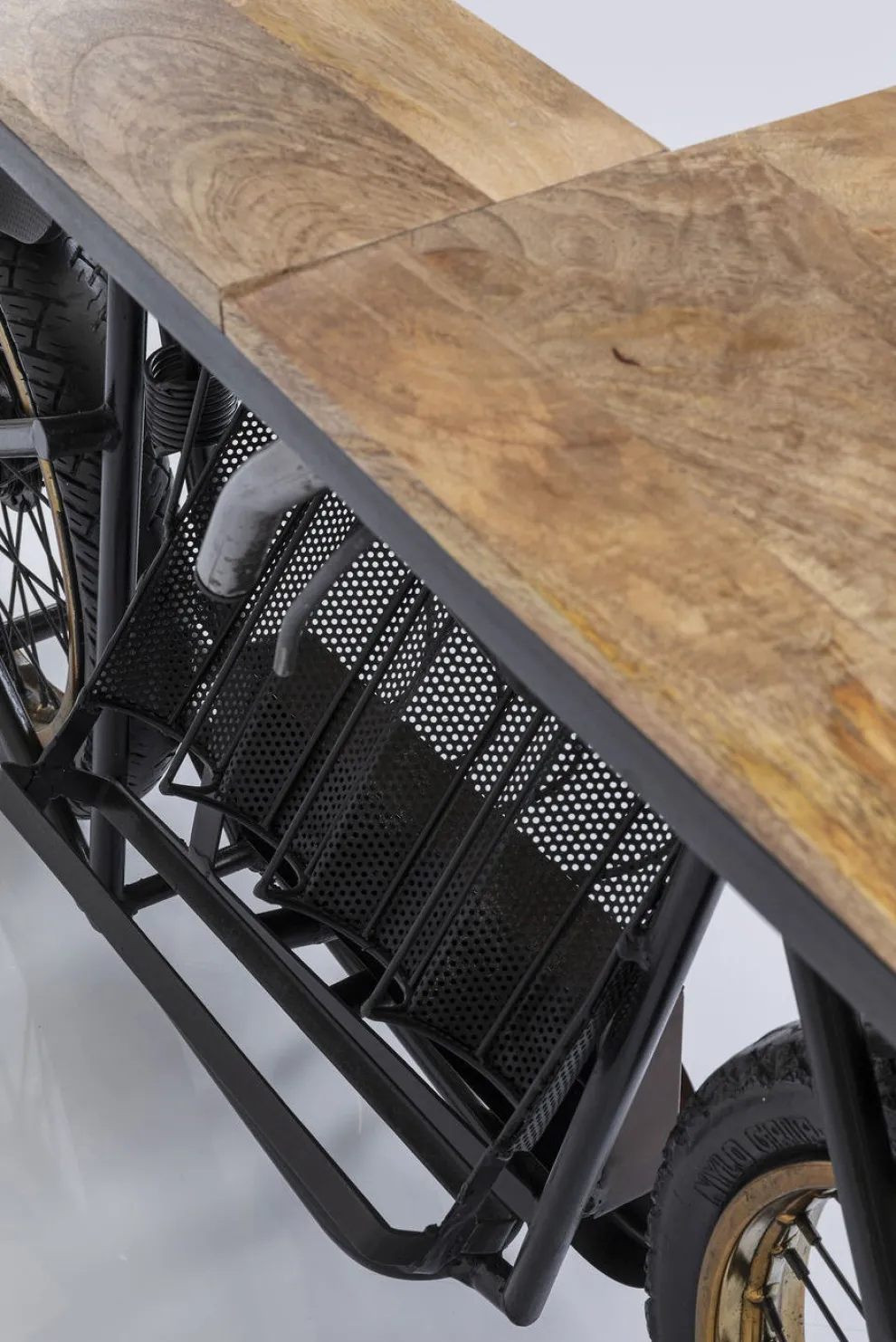 Deze console tafel, die perfect gebruikt kan worden als een bar, is de droom van veel motorrijders: casual industrieel ontwerp, rustiek mangohouten top en vele retro details.