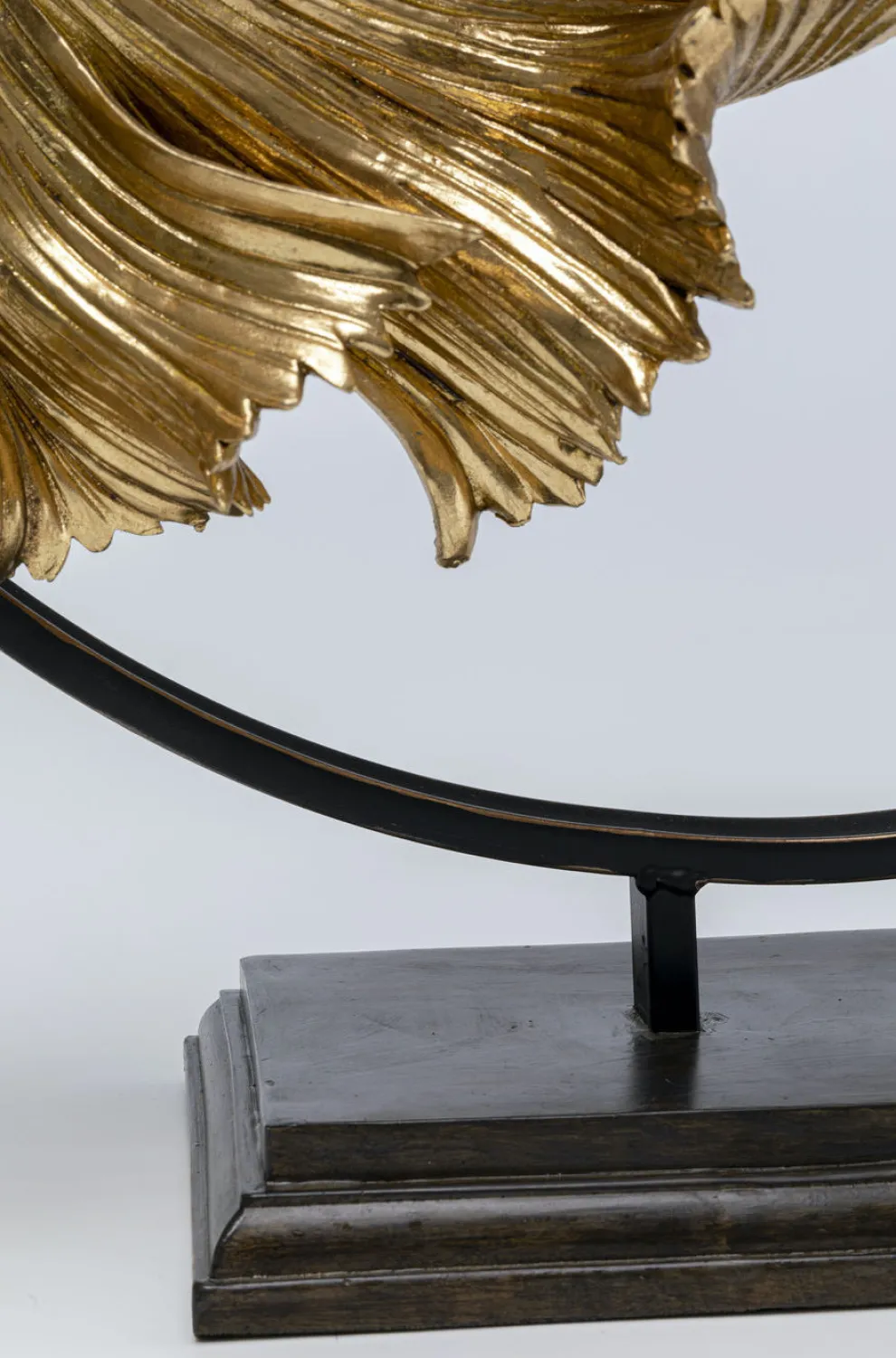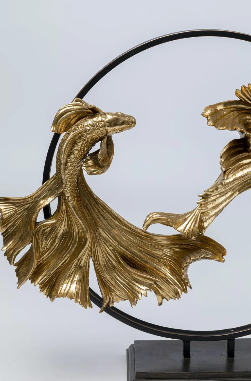 Dit decofiguur heeft natuurlijk niet voor niks deze naam gekregen. Op deze prachtige creatie zijn 2 vissen afgebeeld die met elkaar lijken te dansen. Wat een aanzicht! De uitgebreide details en het gouden uiterlijk van deze vissen ziet er zo majesteus uit. Gemonteerd op en stalen, zwarte cirkel, wordt er een mooi contrast gecreëerd en lijk je te kunnen herkennen in welke richting de vissen zich willen bewegen. Door hun platte zwarte achterkant, zijn deze vissen makkelijk en mooi dicht tegen een wand of raam aan te plaatsen. Bijvoorbeeld op een dressoir of vensterbank.