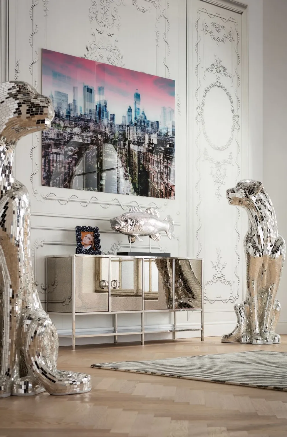 Moderne verfijning. Dit dressoir in de Moonscape serie maakt indruk met zijn unieke combinatie van duidelijke vormen, verfijnde details en monochrome look. Glanzend roestvrij staal en grijs spiegelend glas met een antieke look geven deze meubel een mystieke en glamoureuze tint. De ronde handvaten van de deur maken zijn uiterlijk succesvol compleet. Veel opbergruimte zit verstopt achter de vier deuren.