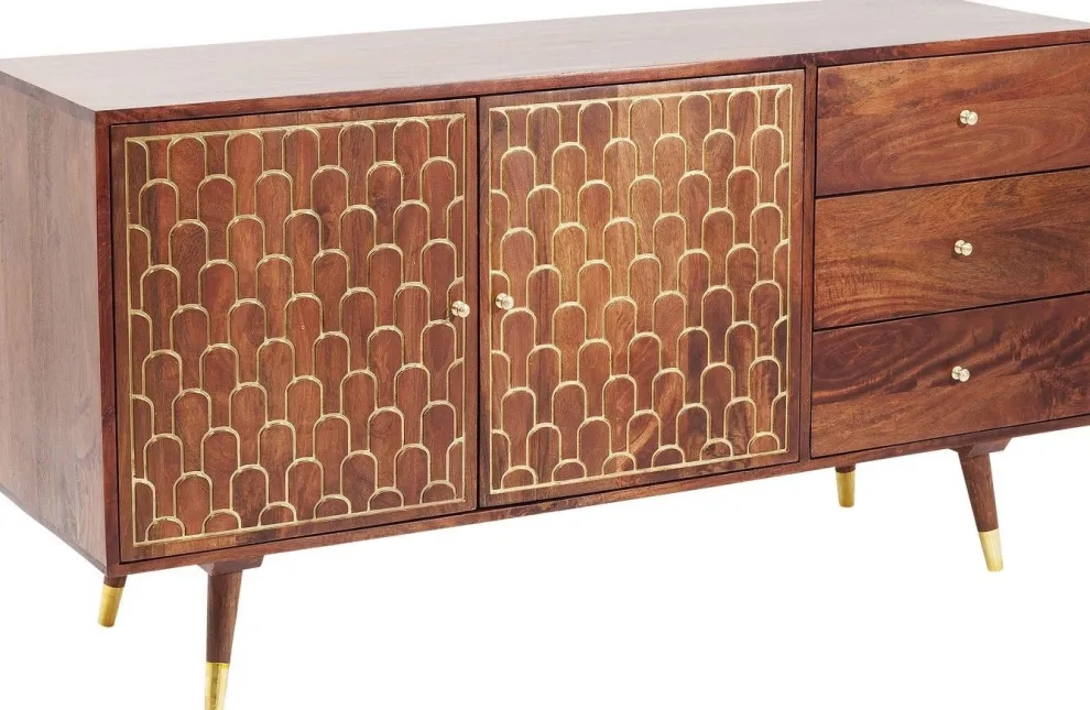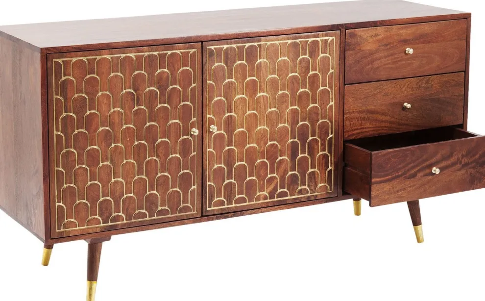 De rijke bruine kleur van het dressoir straalt tijdloze klasse uit, en het natuurlijke karakter van mango hout geeft het een klassieke uitstraling die nooit uit de mode raakt.