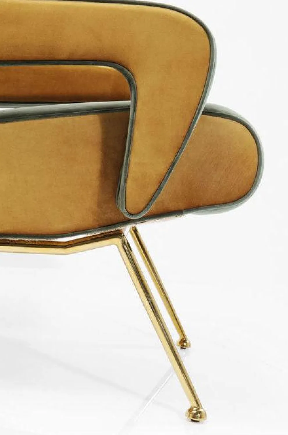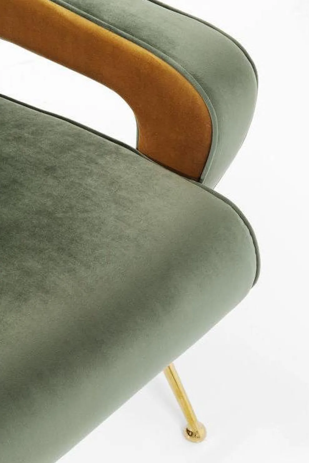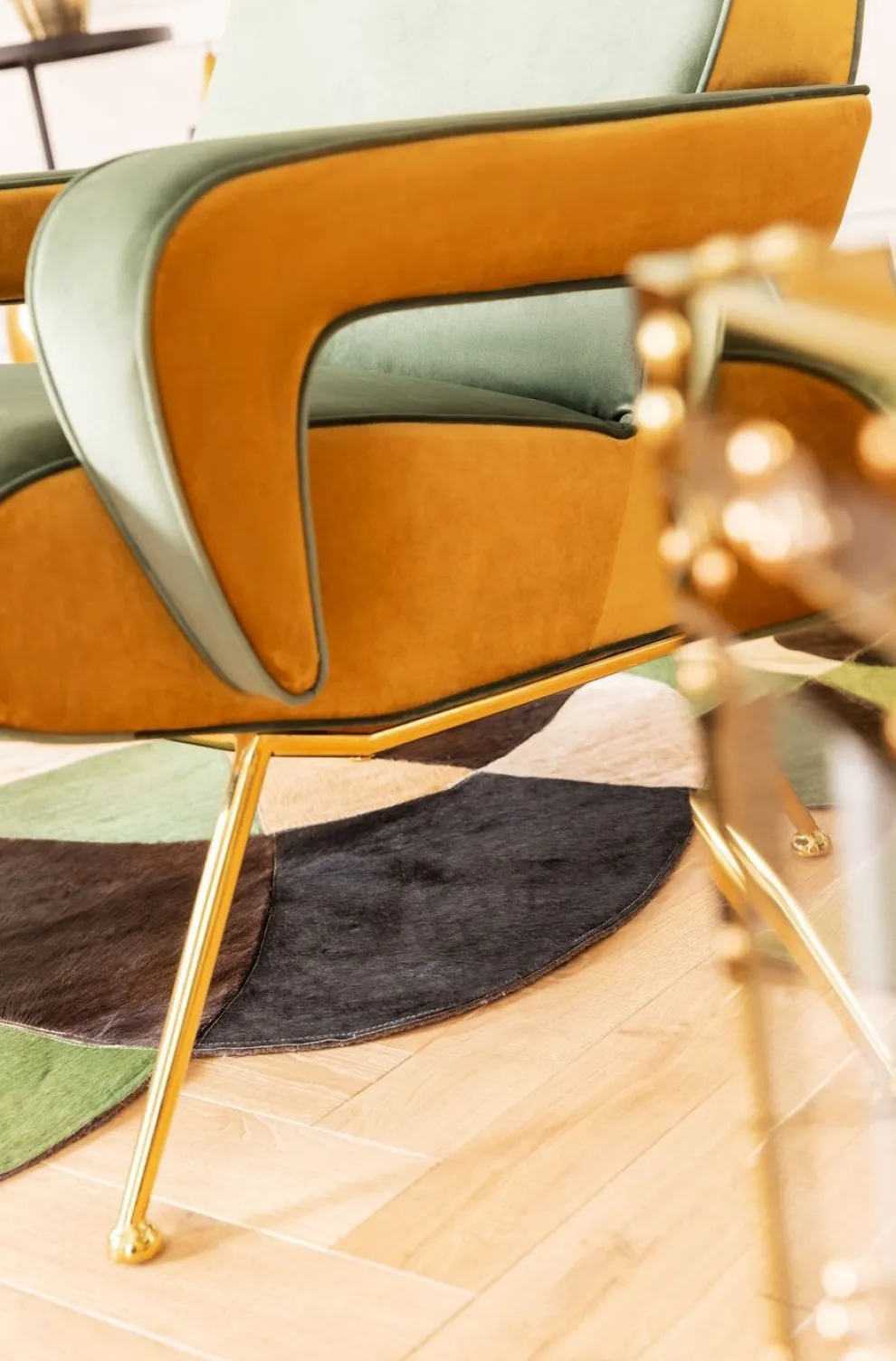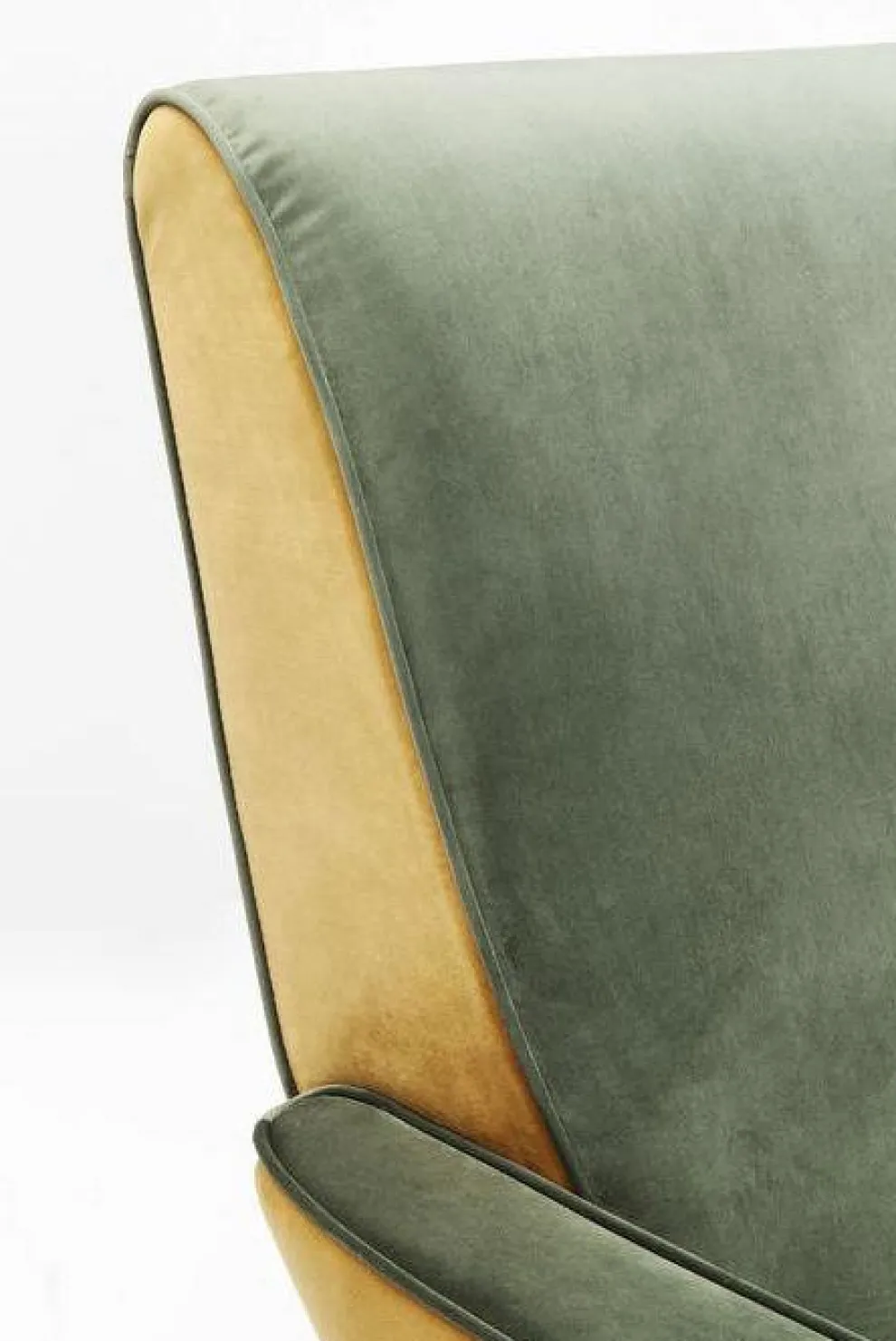 De kleur is een dromerige combinatie van groen en oranje. Ja, je leest het goed. Deze stoel is niet bang om op te vallen in je woonkamer. Het fluwelen groen nodigt uit tot aanraken (en geloof me, dat wil je), terwijl de oranje accenten zorgen voor een speelse twist.