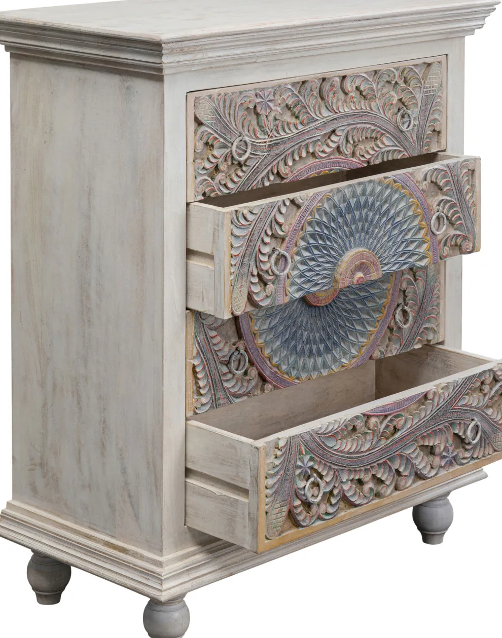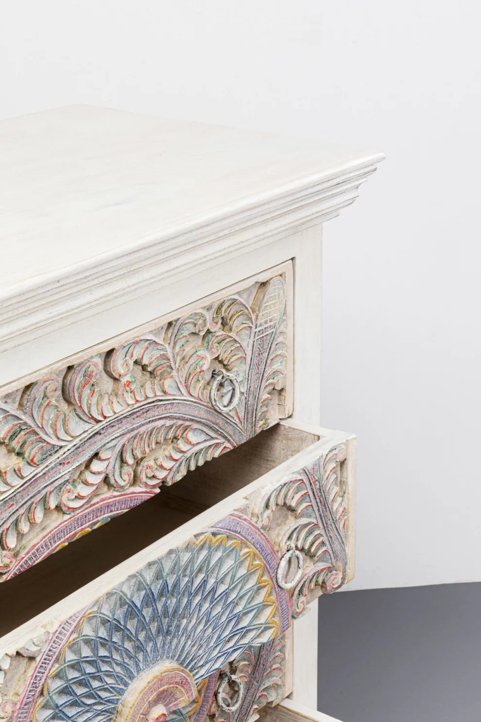 De kast is vervaardigd uit duurzaam mango-hout, waardoor hij niet alleen stevig en betrouwbaar is, maar ook een natuurlijke en warme uitstraling heeft. De meerkleurige afwerking en handgemaakte details geven de kast een unieke en karakteristieke uitstraling die perfect past bij een bohemien interieur.