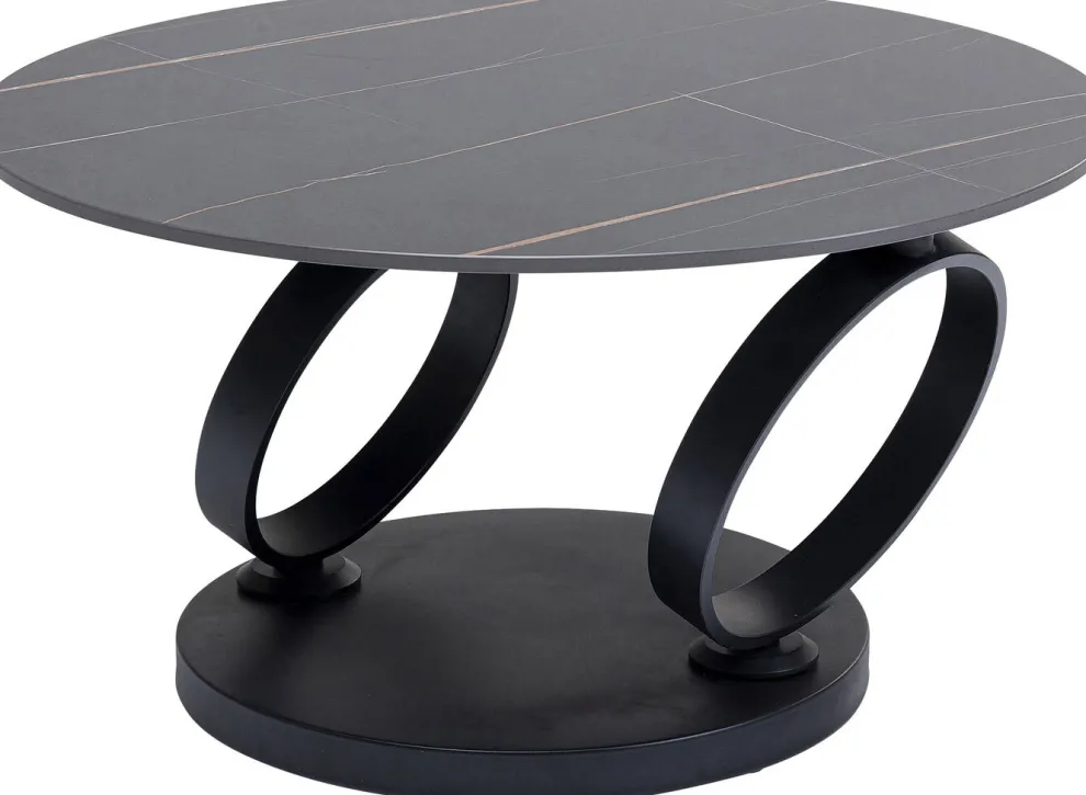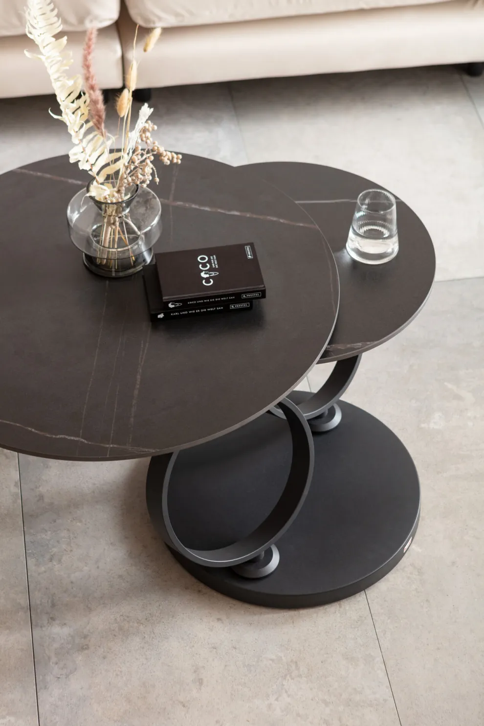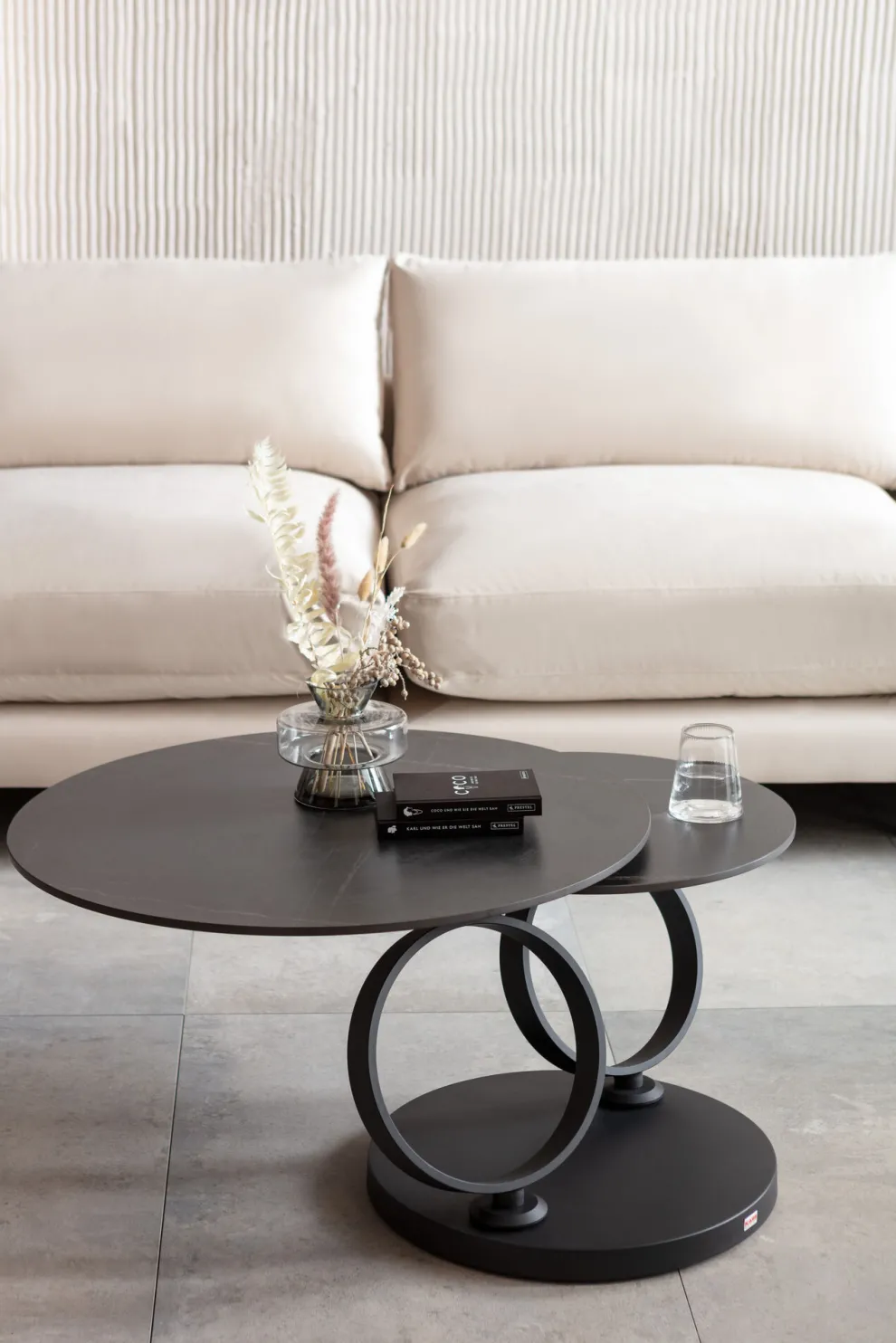 Deze salontafel heeft een boeiend uiterlijk en brengt een luxe rust en duurdere interieurstijl in je huis. De ronde basis en de twee ring-vormige stalen frames zijn prachtig gelakt in mat zwart. Last but not least, Beverly is eindeloos praktisch. Of het nu naast je hoekbank of bank staat, deze salontafel past zich graag aan, aan jouw behoeften. Draai simpelweg het grote tafelblad passend en je zult altijd drankjes, hapjes en de afstandsbediening binnen handbereik.