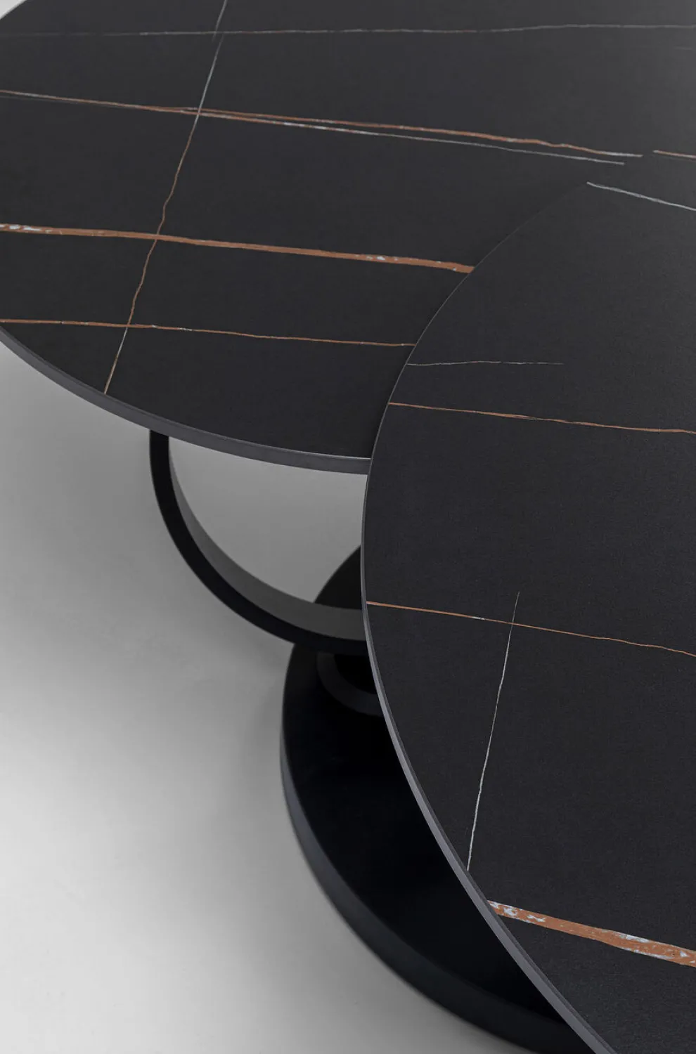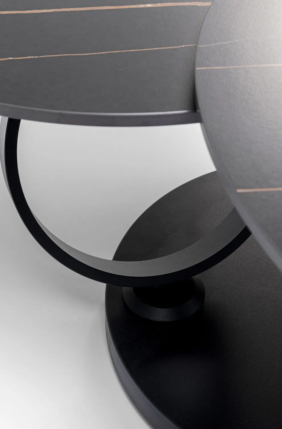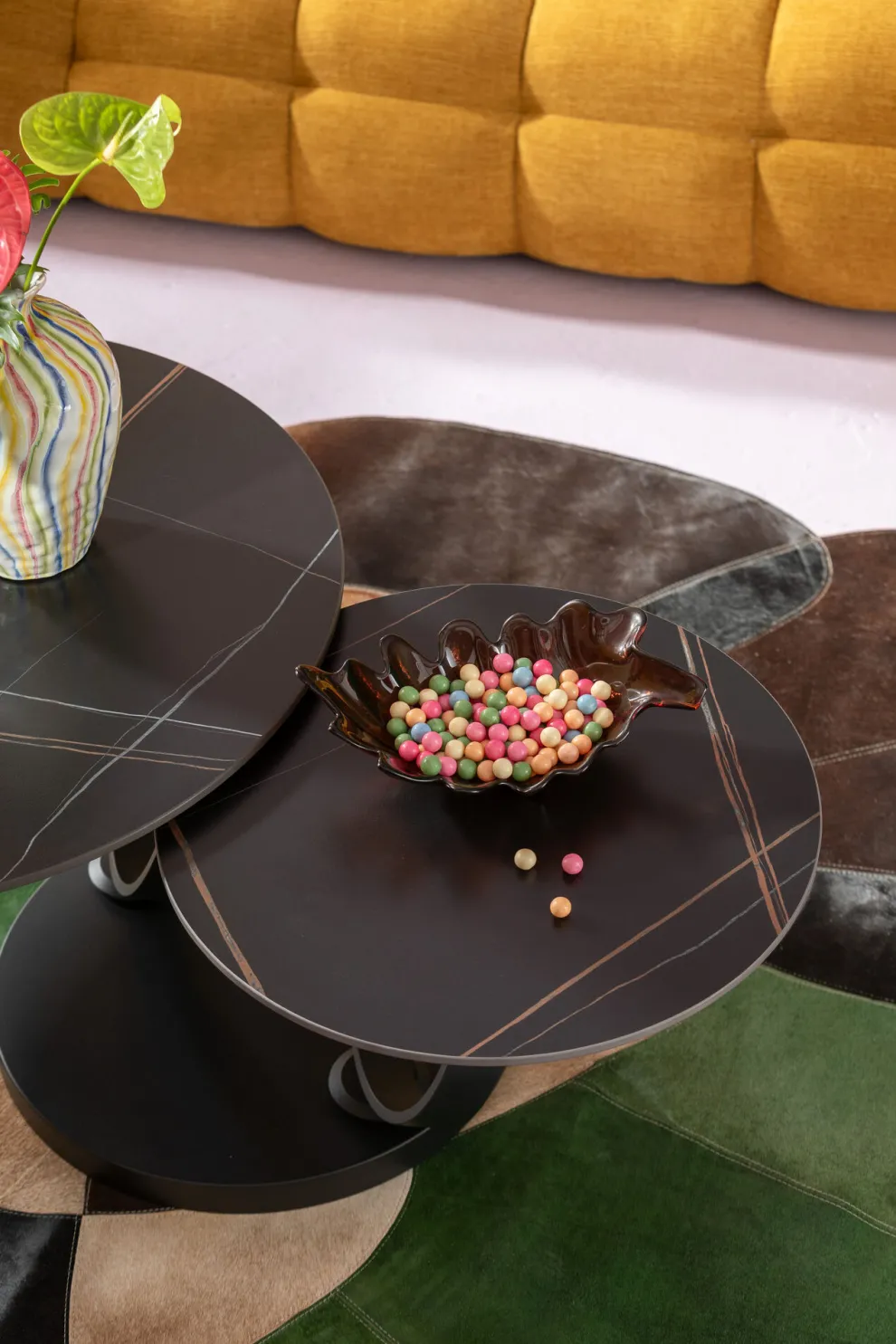 Deze salontafel heeft een boeiend uiterlijk en brengt een luxe rust en duurdere interieurstijl in je huis. De ronde basis en de twee ring-vormige stalen frames zijn prachtig gelakt in mat zwart. Last but not least, Beverly is eindeloos praktisch. Of het nu naast je hoekbank of bank staat, deze salontafel past zich graag aan, aan jouw behoeften. Draai simpelweg het grote tafelblad passend en je zult altijd drankjes, hapjes en de afstandsbediening binnen handbereik.
