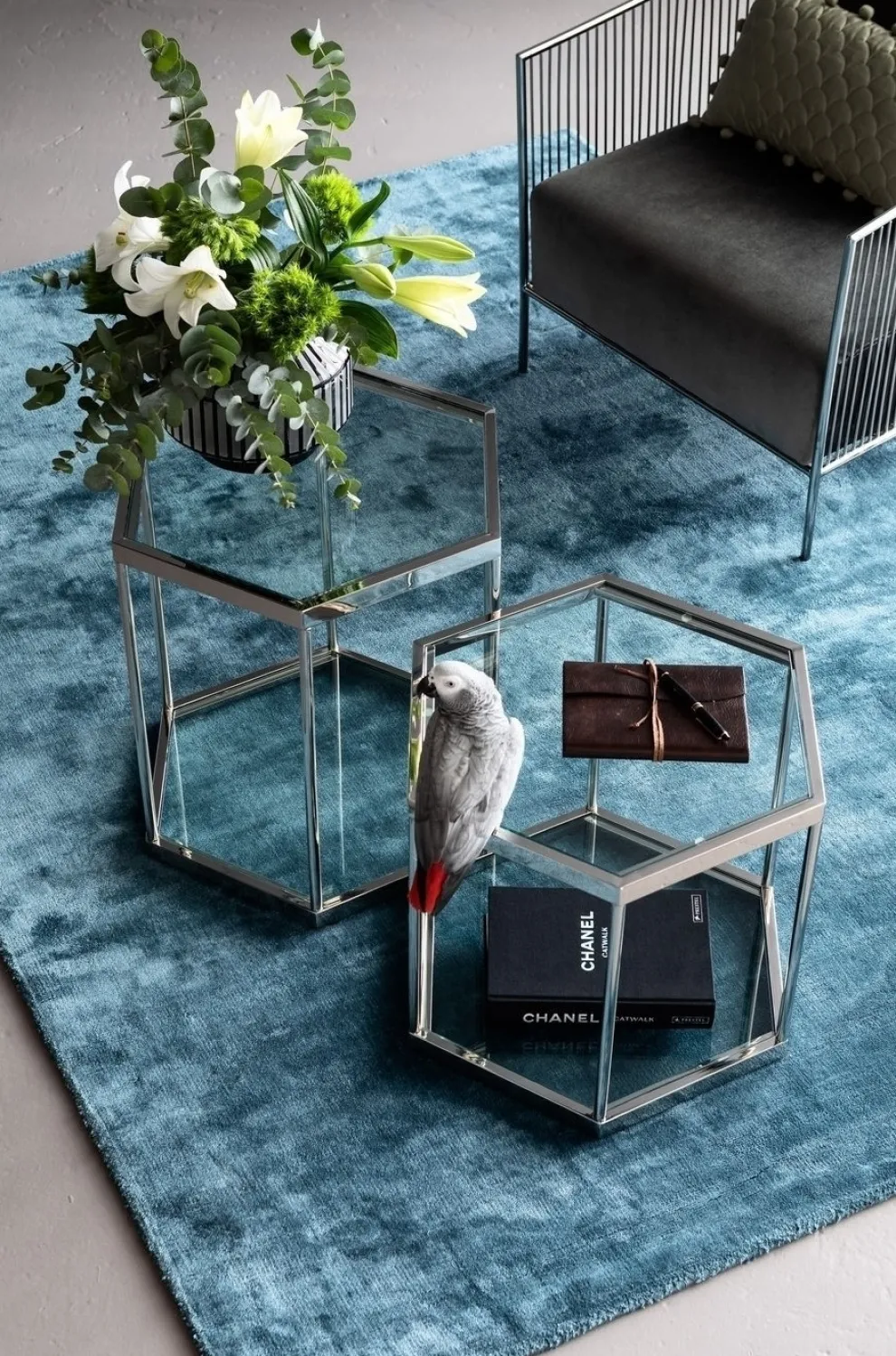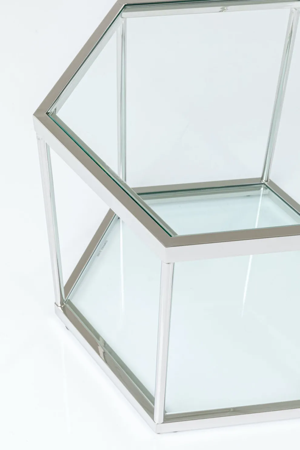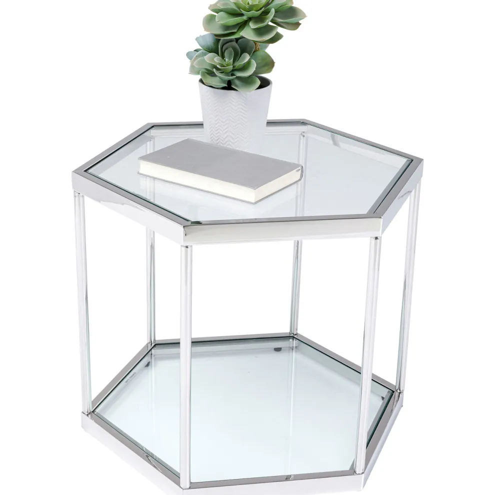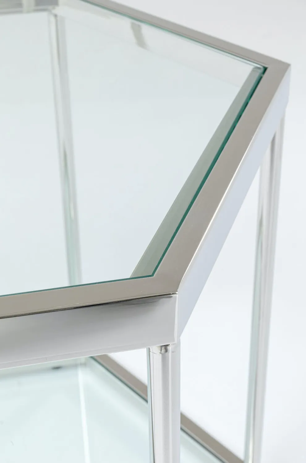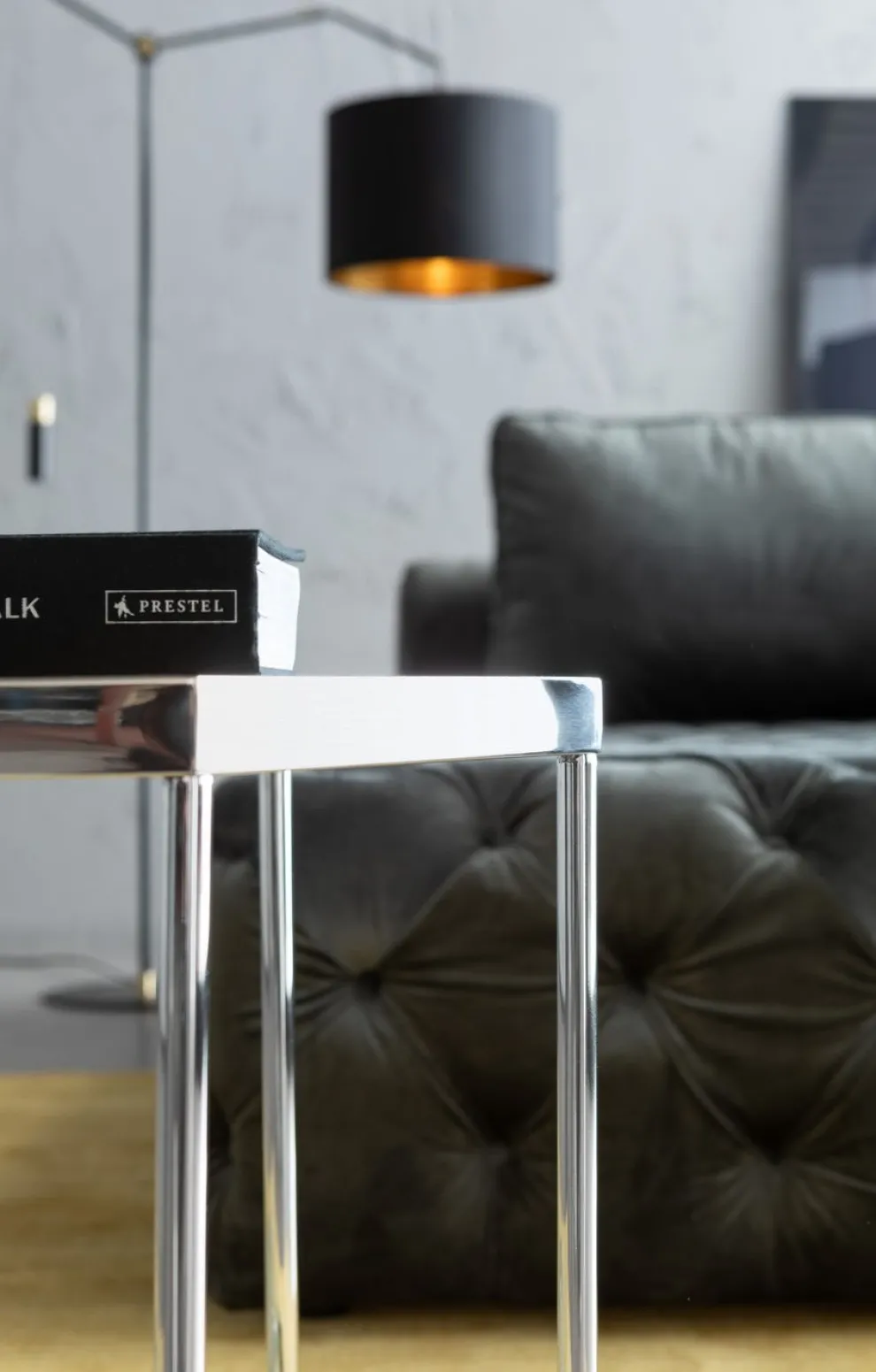 De kleine zilveren tafel brengt glamour in de woonkamer zonder te opdringerig te zijn. De lage, extra flazen plank voor boeken, tijdschriften en de afstandsbediening is een praktisch kenmerk.