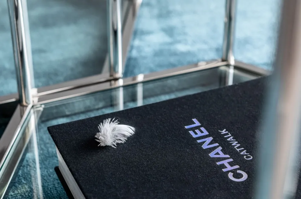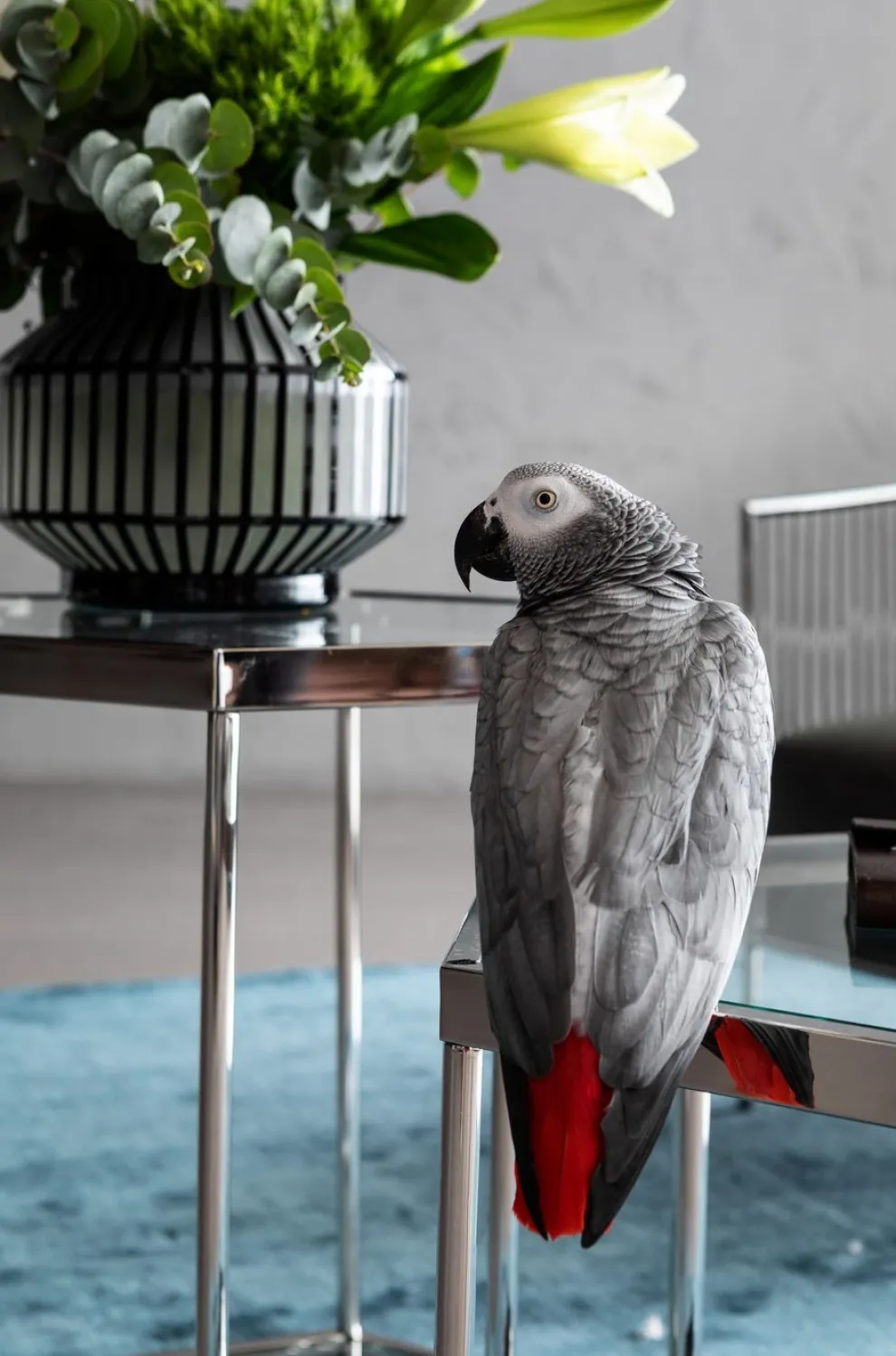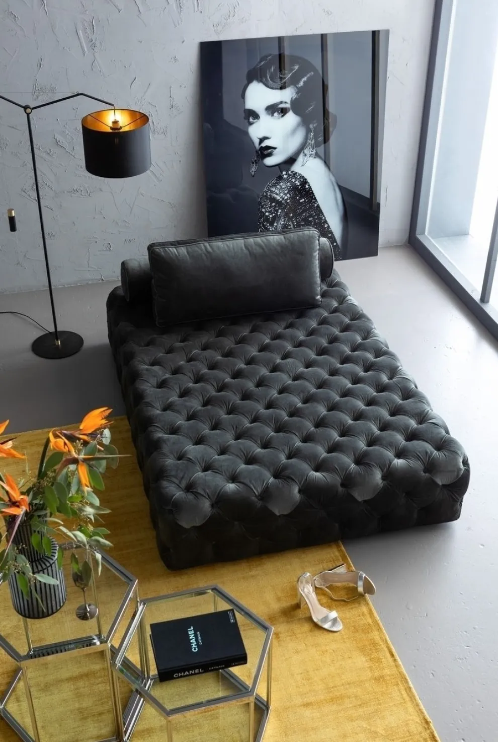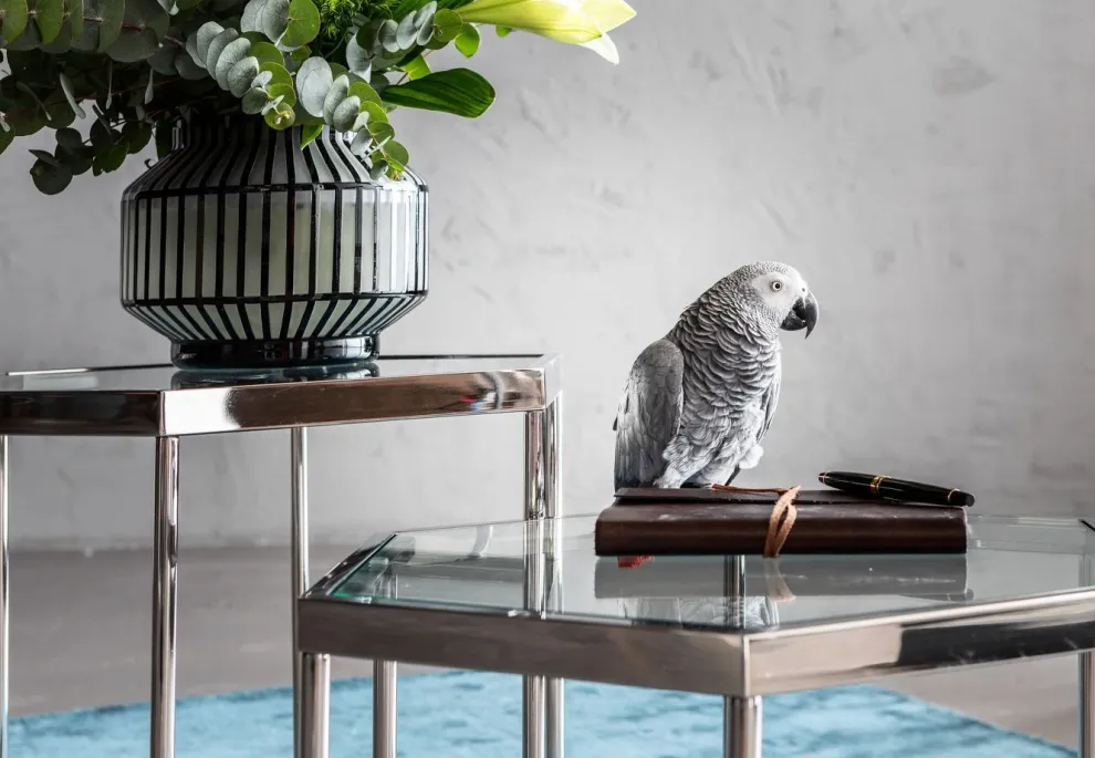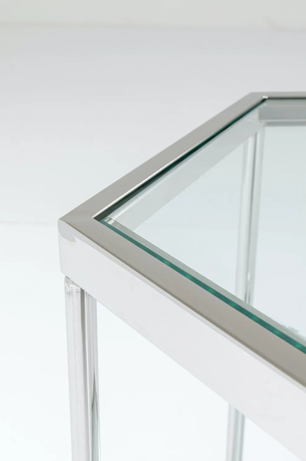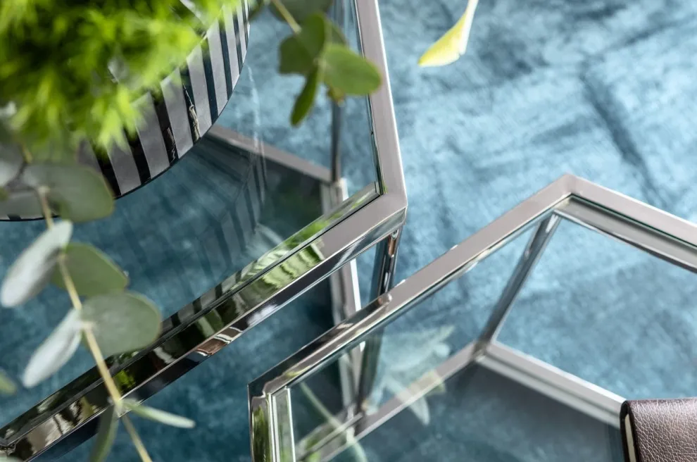 De kleine zilveren tafel brengt glamour in de woonkamer zonder te opdringerig te zijn. De lage, extra flazen plank voor boeken, tijdschriften en de afstandsbediening is een praktisch kenmerk.