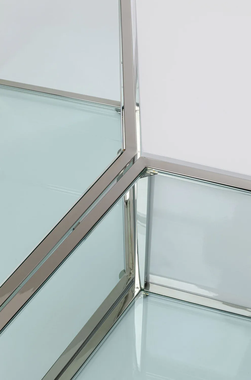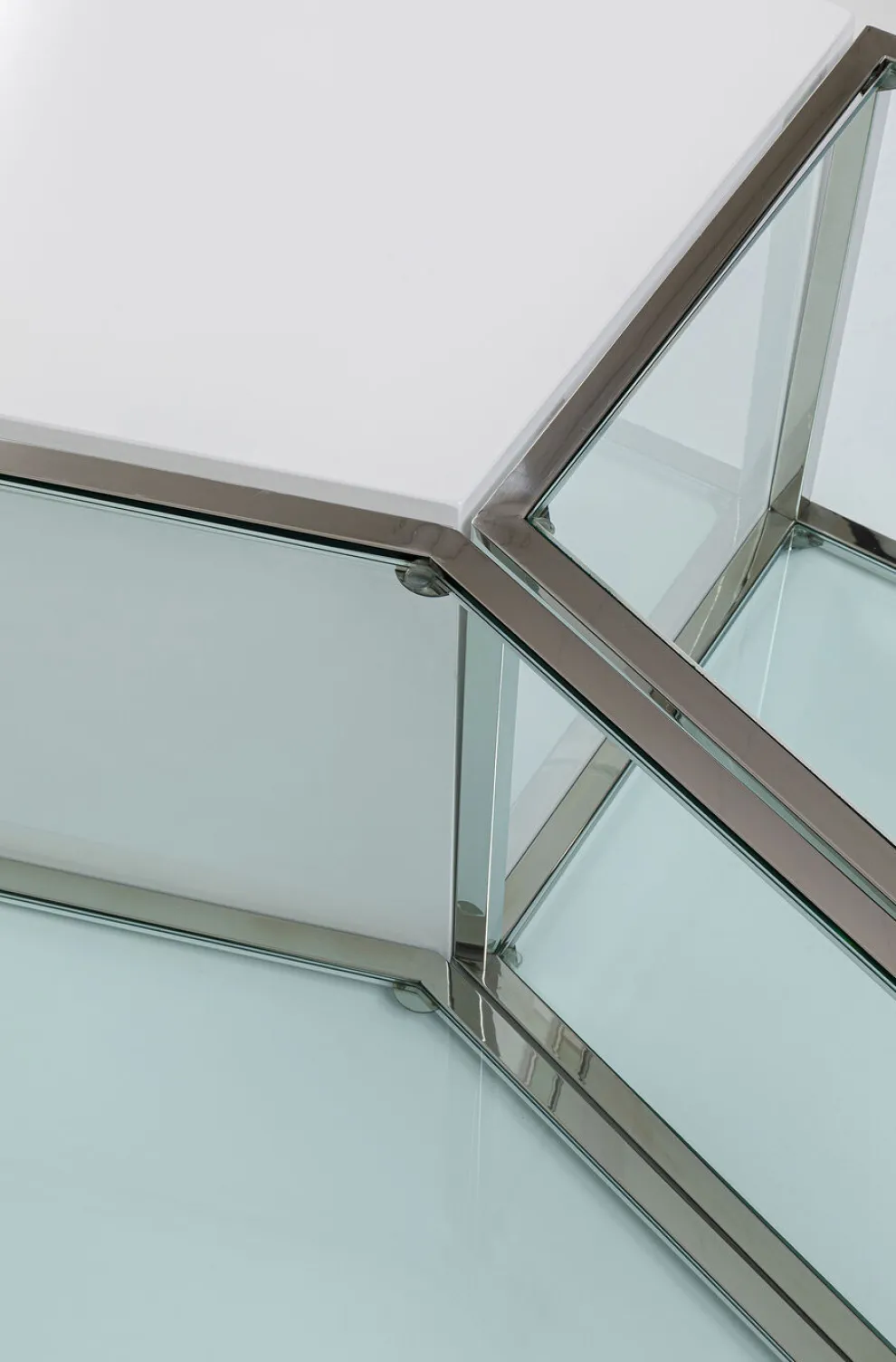 Zo uniek heb je een salontafel nog nooit gezien! Met maarliefst 3 losse tafels, die ook perfect aan elkaar te schuiven zijn door de op elkaar afgestemde vormen. Zie het als een chique variant van tetris, schuiven maar! Het glas, het zilveren frame en de witte kleur zorgen voor een frisse aanvulling op de zithoek in je woonkamer, of waar je deze prachtige set ook wilt plaatsen.