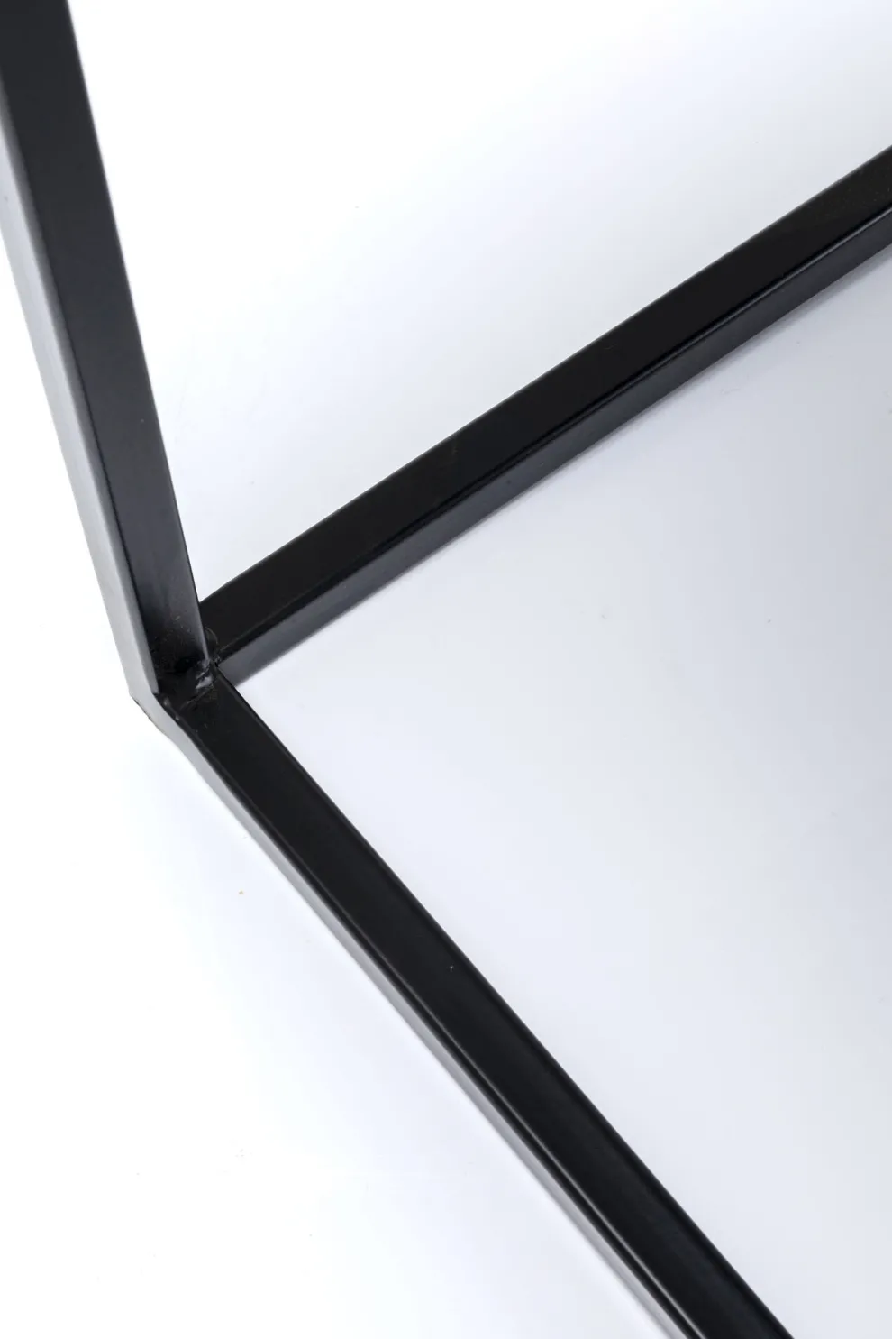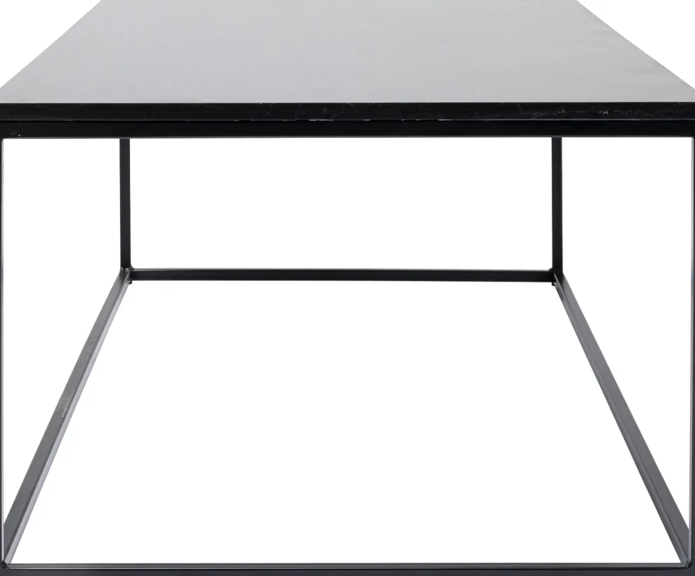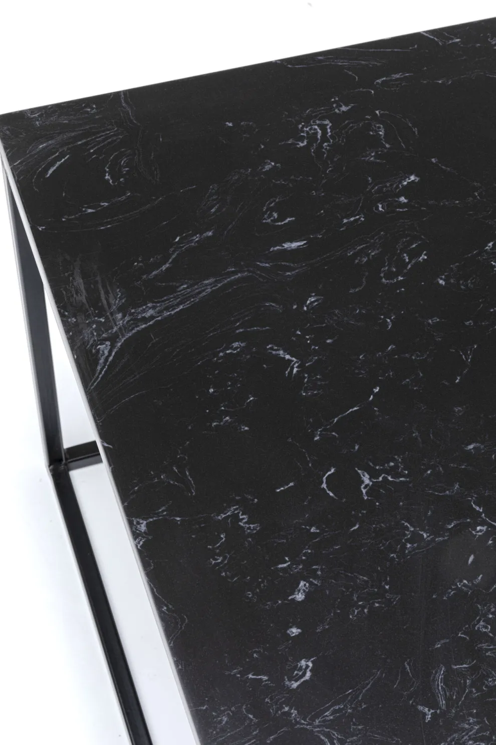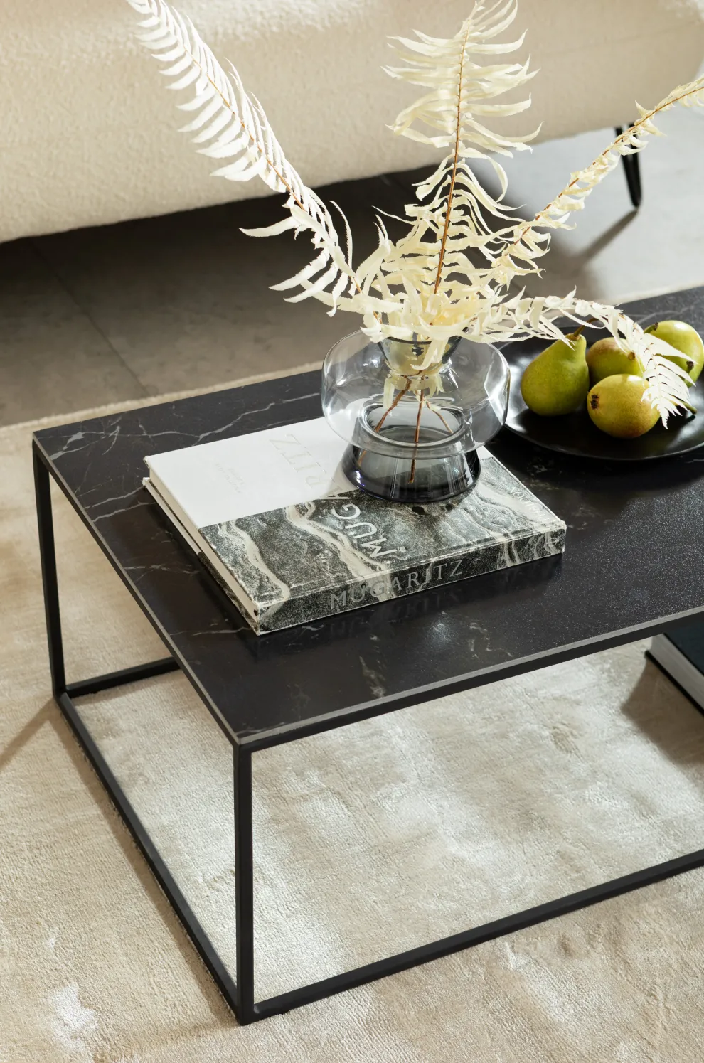Deze simpele tafel kan je nog wel eens gaan verbazen, zodra je hem van dichtbij bekijkt. Niet alleen heeft het zwarte tafelblad een marmerachtig patroon, ook reflecteert hij licht de object die erop staan. Hierdoor creëert hij prachtige effecten. Het slanke frame zorgt ervoor dat de ruimte erg open lijkt en de zithoek groter. Perfect voor kleinere woonkamers dus.