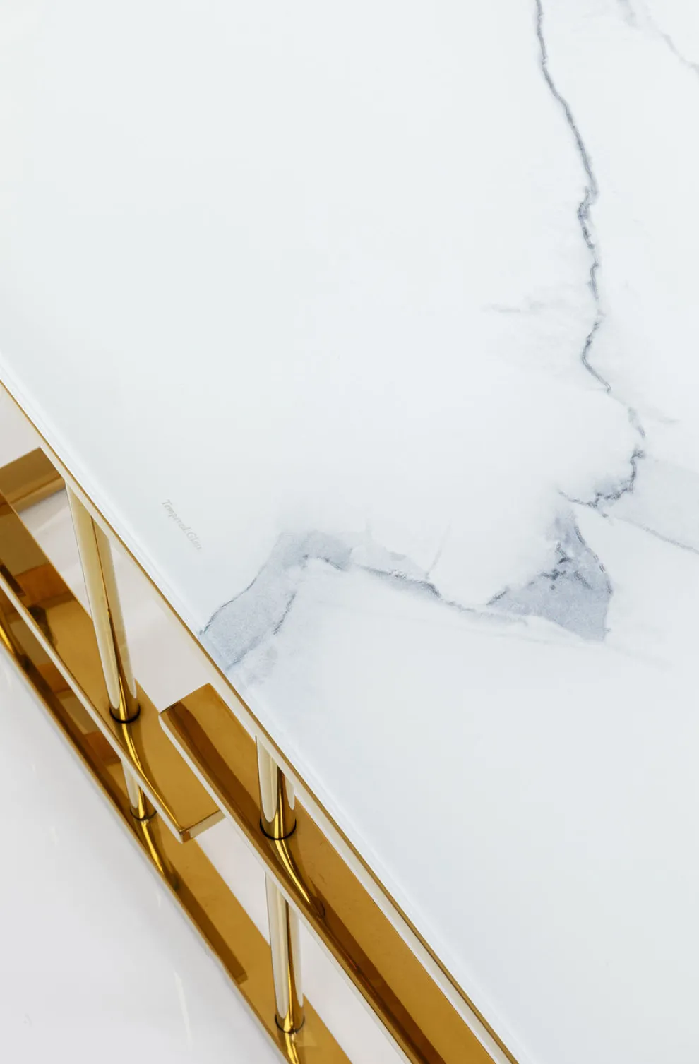 De salontafel is vervaardigd uit hoogwaardige materialen, waaronder glas en roestvrij staal, en is afgewerkt in een verfijnde combinatie van wit en goud. De gouden poten voegen een vleugje luxe toe aan het geheel en zorgen voor een harmonieuze balans tussen klassiek en eigentijds design.