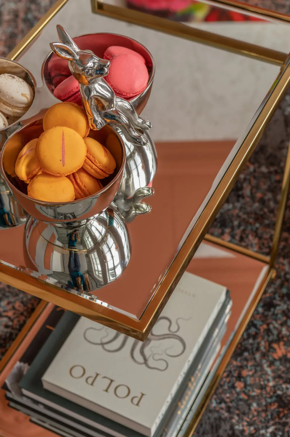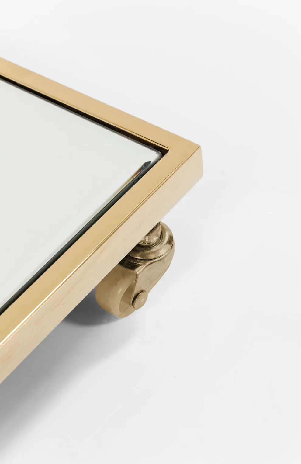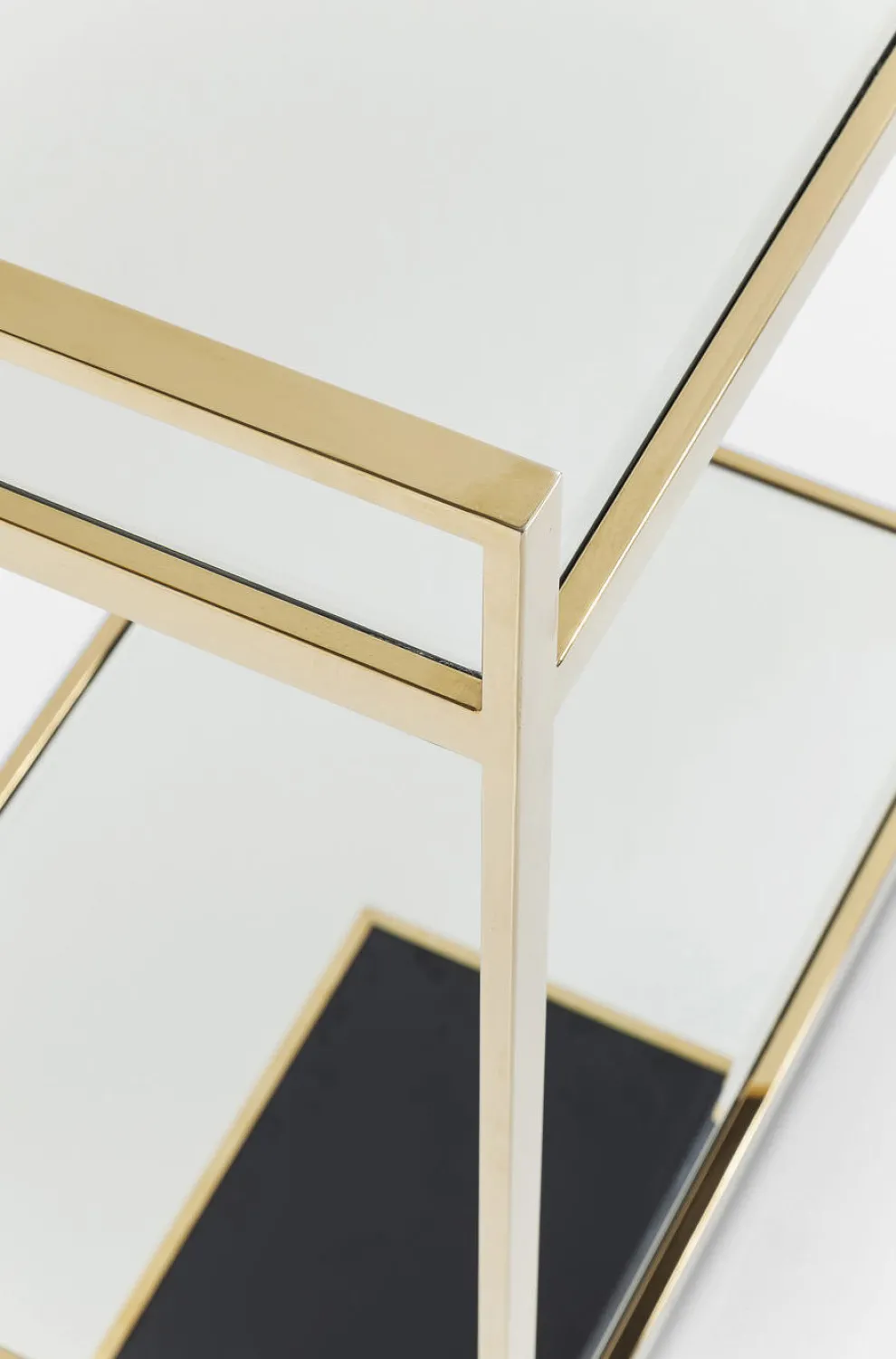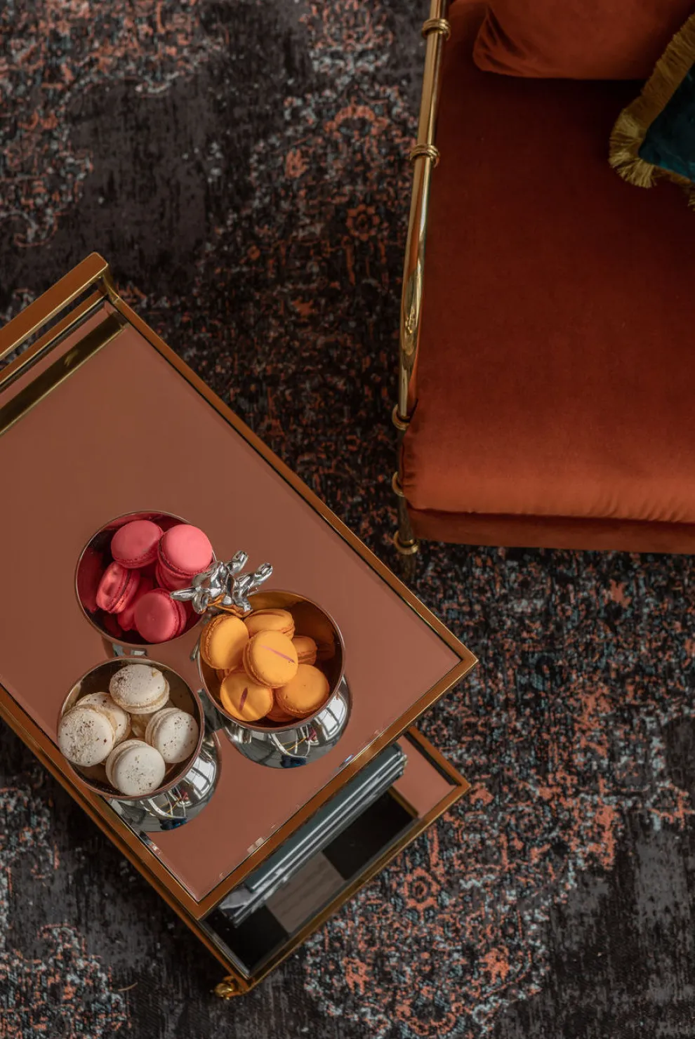 Het serveren van stijl. Of het nu Gin en Tonic is, whiskey sour, Martini of een cosmopolitan, met deze sierlijke bar trolley worden drankjes in stijl geserveerd. Hij biedt ruimte op twee hoogtes voor de elegante presentatie en het vervoer van drankjes, snacks en meer. De combinatie van de exclusieve kleur en het materiaal van messing-gekleurd roestvrij staal en zwart veiligheidsglas zorgt voor een vleugje luxe en glamour, versterkt door de strak-gelijnde vormen. Vier wielen zorgen ervoor dat deze trolley mobiel is, dit betekend dat die er niet alleen goed uitziet, maar hij ook indruk maakt met zijn praktische waarden.