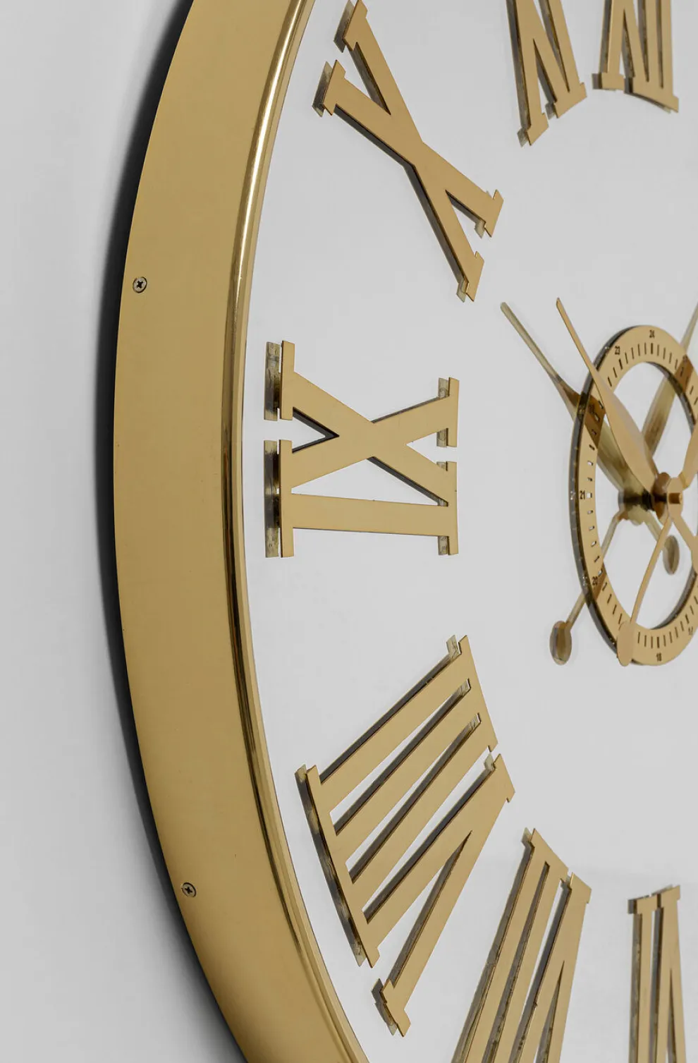 De prachtige wandklok van KARE met zijn gespiegelde wijzerplaat en goudkleurige wijzers is een lust voor het oog. Het roestvrijstalen frame met titanium coating zorgt voor stabiliteit en duurzaamheid, terwijl de spiegelende glazen wijzerplaat voor een modern design zorgt. De goudkleurige aluminium wijzers en de achterwand van vezelplaat geven de klok een luxueuze uitstraling. Met een diameter van 76 cm is het een decoratieve blikvanger aan elke muur.